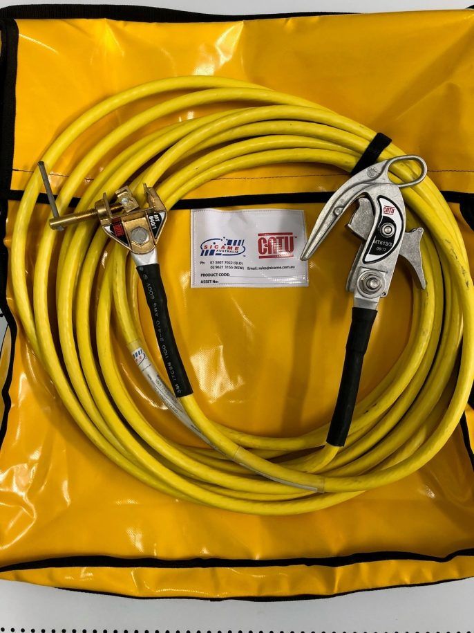 Earth lead – 16kA with PVC bag. 14m 85mm2 lead with Catu MT-613/3 snap clamp one end and Catu MT-840/1 earth clamp on the other.