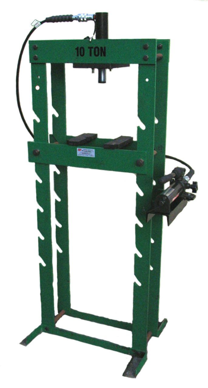 High Quality 10 Tonne Hydraulic workshop press. Includes roll head, vee blocks, 10T 6" stroke spring return cylinder, hand pump, hose, gauge and gauge adaptor. Hydraulics can be removed and used for lifting or jacking applications if required.