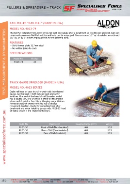The RailPull rail puller from Aldon brings rail back into gauge after a derailment so rerailing can proceed. Cars can