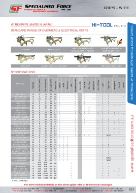 WWL(kN) Min Cond (mm²) Max Cond (mm²) Jaw Length (mm) Weight (kg) Copper ACsR Aluminium ABC Covered Conductor Contact Wire Guy Wire Wire Rope Barbed Wire Live Line Rings Latch Trigger Grip spring Latch Notched Locking