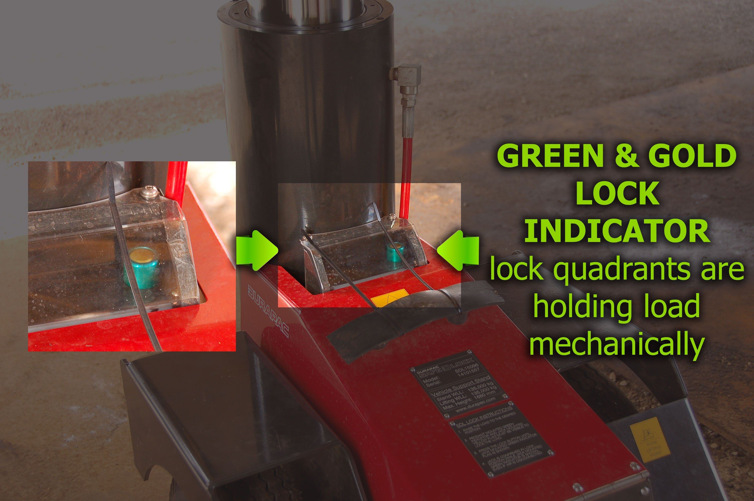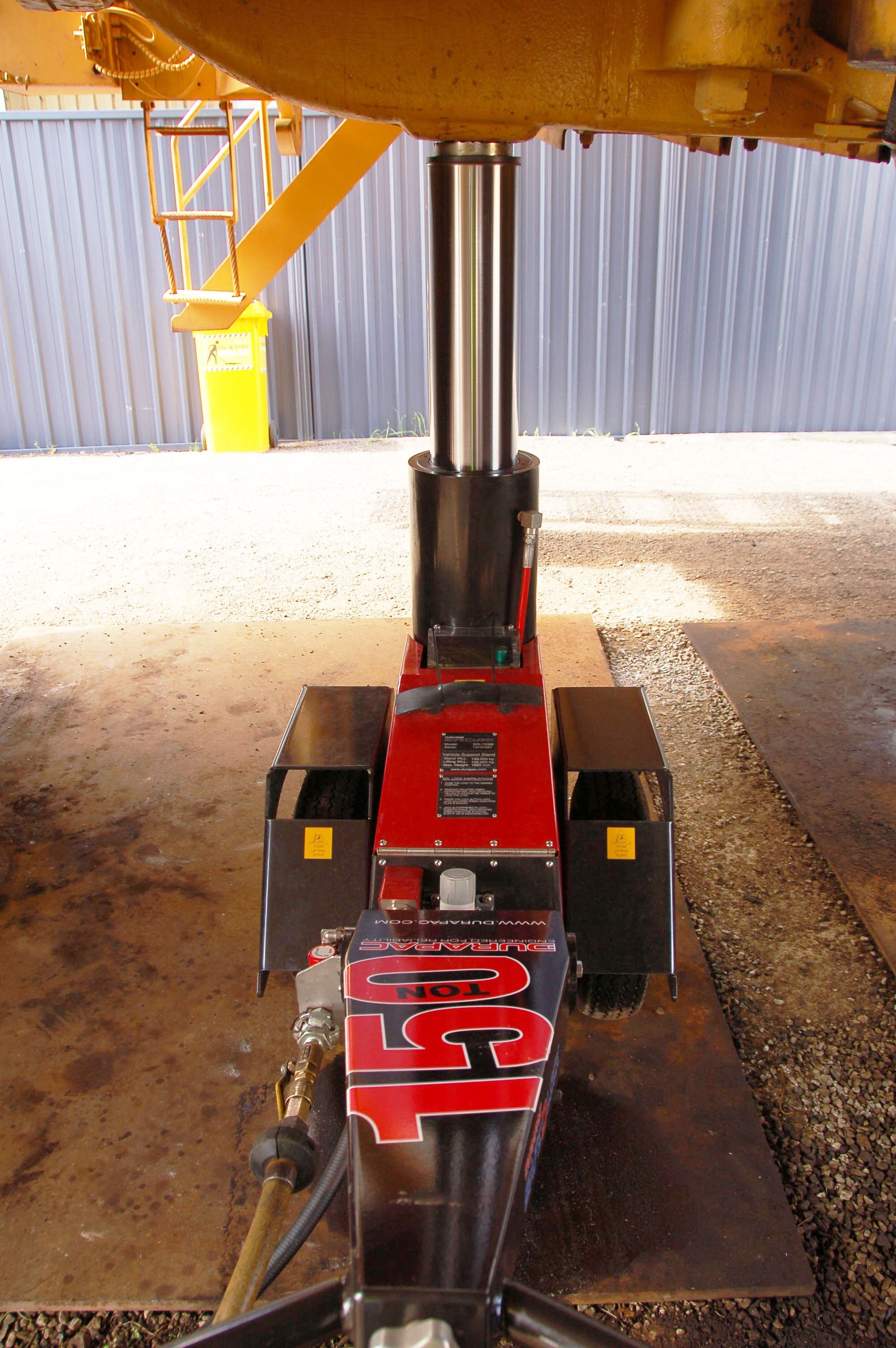 In this particular instance pictured the CAT789B dump truck with a net weight of just over 123 tonne was no problem for the single Durapac™ SAFE-D-LOCK™ unit # SDL-15096. 150 ton capacity with 980mm collapsed height and a no extension required.