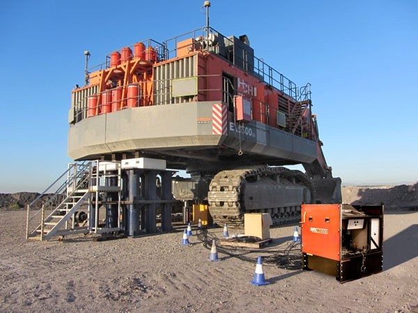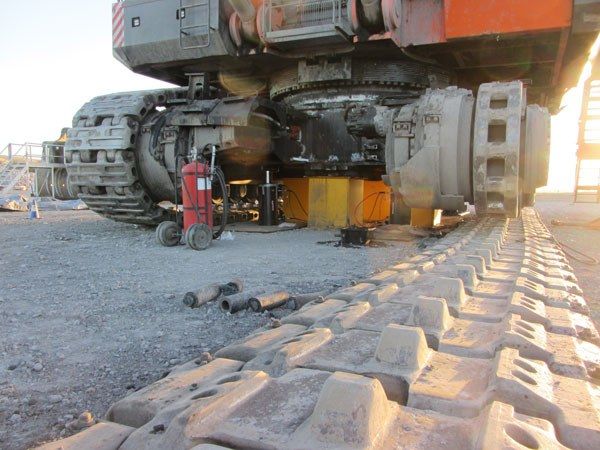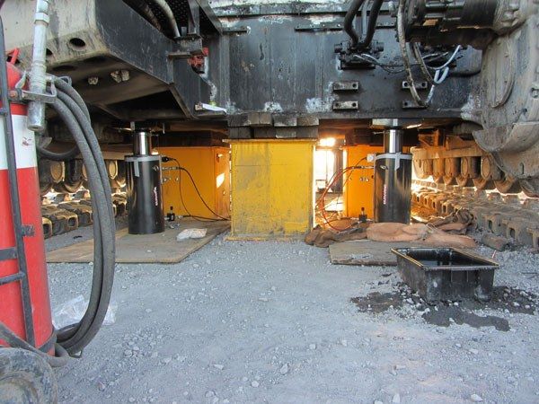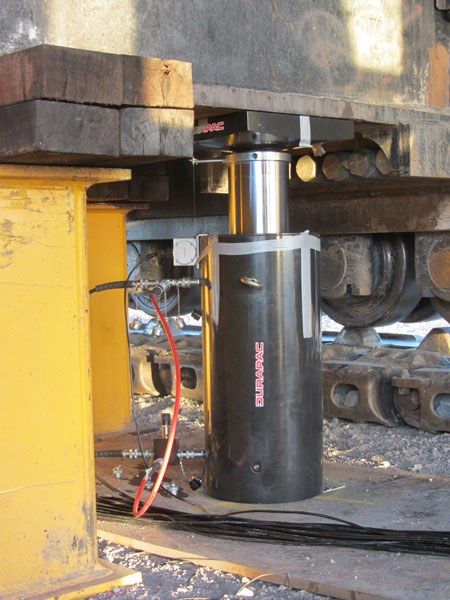 The client needed to remove the track frames from a Hitachi EX5500 Hydraulic Excavator - operating weight 522 tonne. The Durapac SyncMaster combined with 4 x 500 tonne capacity RD-50018 cylinders provided a high level of precision and safety. The precision was particularly important during re-assembly of the track frames and allowed the mounting bolts to be efficiently assembled. The Syncmaster has a number of key safety features that were used during this jacking procedure including centre of mass monitoring, maximum loads per lift point and fine tolerances of 0.5mm between cylinder displacements.