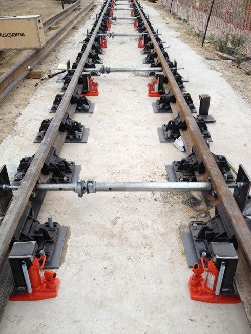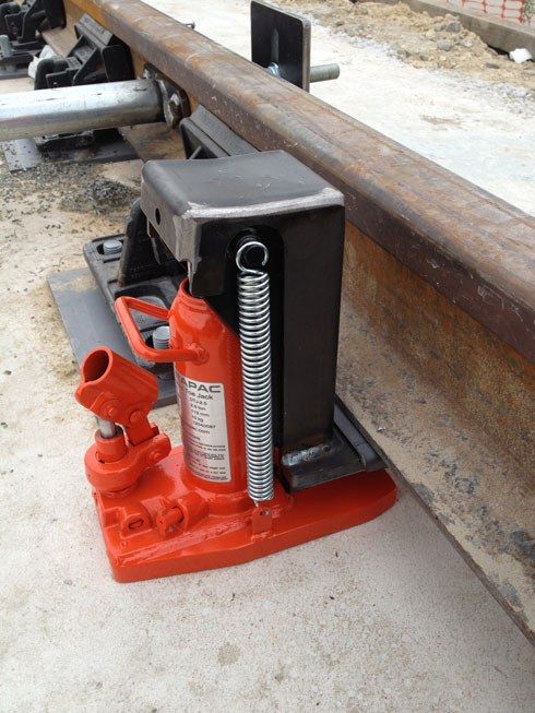This rail contractor had a requirement to assemble insulated track panels prior to the installation of a new track in tunnels. 24 Durapac DTJ-2.5 (2.5-tonne capacity) toe jacks were used to lift and lower the lengths of the rails onto the insulated pads so the levels could be set prior to assembly. These toe jacks provided an inexpensive alternative to purchasing track jacks for this purpose.