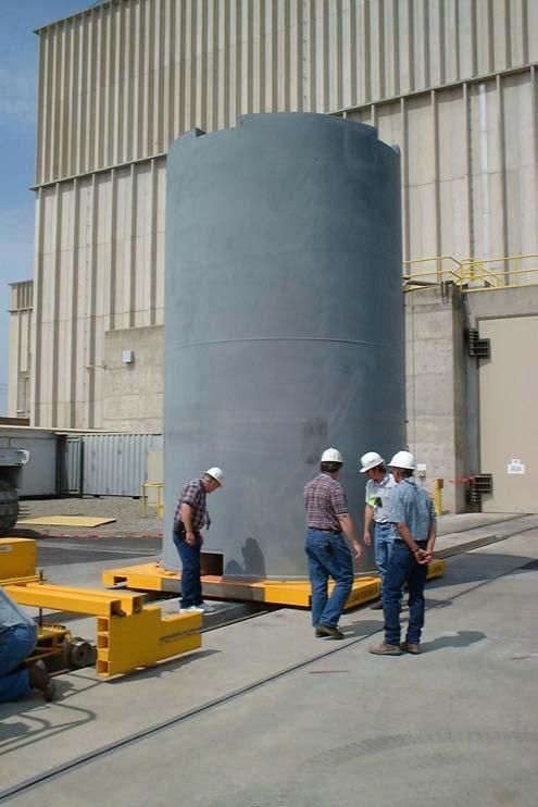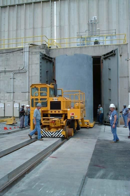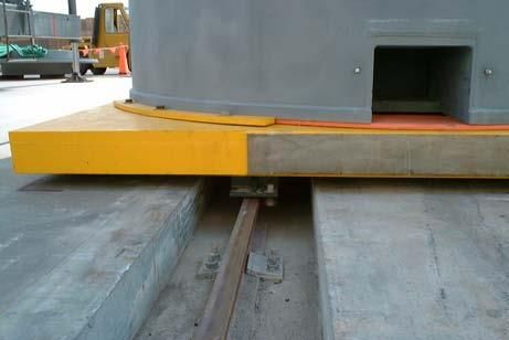 Hilman Rollers proved to be a high capacity and low profile solution used for the onsite transport of nuclear fuel casks at a nuclear power facility. The rollers used are 150 metric tonne capacity, which are outfitted with high yield steel frames and the Accu-Roll Guidance system to fit the embedded rail track. Once outside, the casks are moved to a concrete pad site for temporary storage. The project required the Hilman Rollers to be bolted to the base plate of a specially designed, low-profile cart used to carry the spent nuclear fuel casks. The casks are transported from inside the reactor building through a set of low clearance hatch doors.