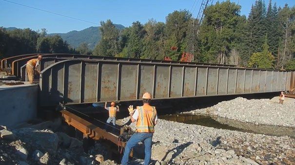 By utilising two sets of the Hilman OT/NT/T Series Rollers - which were capable of handling the heavy load of both bridges, savings were made by not having to purchase four sets for the old bridge roll-out and new bridge roll-in. The Hilman Accu-Roll Guidance System was chosen for use with the rollers as its purpose is to better integrate the roller with uniform track, for maintaining positive alignment during a move. The combination of low friction and accurately guided rollers is advantageous in applications where the rollers are required to travel over great distances and/or the final placement requires precision.